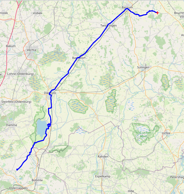 Nach dem Frühstück ging es bei tollem Wetter zunächst nach Bassum. Da ich von Syke schon mal zum Dümmer geradelt bin, war mir die Strecke von Bassum zum Dümmer bekannt. Damals war ich auf dieser Strecke noch mit einem Kurzlieger geradelt und - ich erinnere mich noch - wie ich damals mit über 40 km/h über eine 'Baumwurzel' gefahren bin und mich durch die Unwucht gehoben plötzlich 2 m weiter rechts auf der Straße im Gegenverkehr befunden habe. Zum Glück war gab es kaum Verkehr auf der Straße. Trotz allem handelt es sich um einen gut ausgebauten Fahrradweg, der damals wie in der Jetztzeit Laune gemacht hat.
