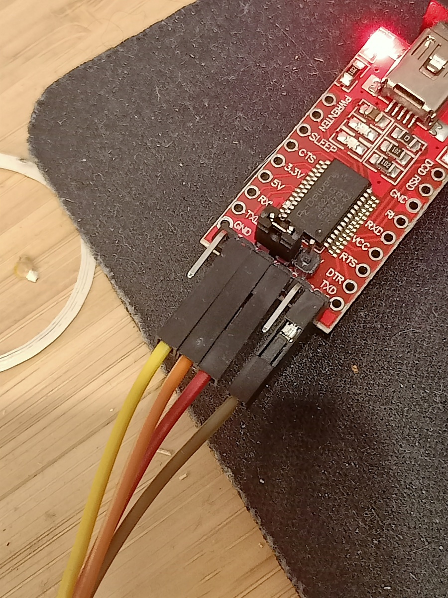 Die Pins RX,TX und Ground müssen verbunden werden. Sowohl der FT232 wie der AZ-Envy-USB-Anschluß müssen aktiv angeschlossen sein. Der AZ-Envy kann über eine USB-Steckdose angeschlossen werden, da hier nur der Strom gebraucht wird. Der FT232 natürlich an das Programmierdevice, also PC, Raspberry-Pi oder was auch immer. Die Arduino-IDE lädt nach dem Compilieren den Code auf den AZ-Mini über den FT232. Um den AZ-Mini in den Flashmodus zu versetzen, drücke ich schon beim Compiliervorgang den Reset- und Flashbutton auf dem AZ-Min gleichzeitig. Sobald i der IDE im Consolfenster Connecting... erscheint lasse ich den Reset-Button los. Den Flashbutton drück ich noch weiter, bis die Meldung Writing at mit Prozentangabe erscheint. Es mag auch anders gehen. So funktioniert es für mich reibungslos.